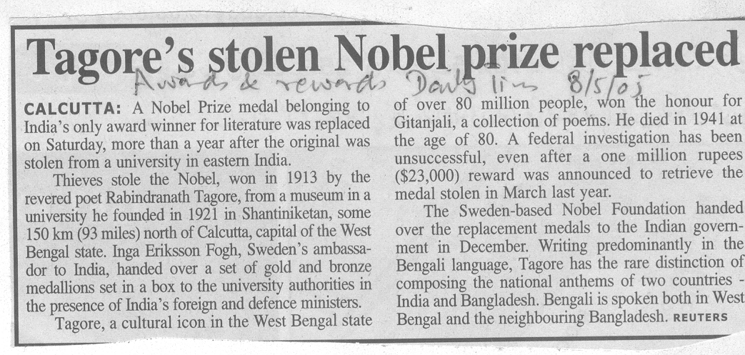 Tagore stolen Nobel Prize replaced , daily Times , 8.05.05.bmp